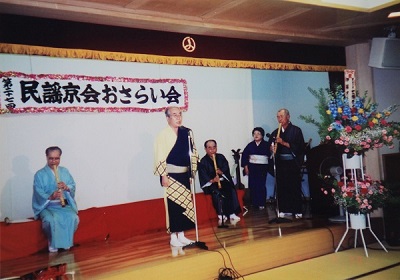 まずは民謡ですね。下手の横好きですが、もう50年近くやっています。初めたきっかけはうちの会社の社員さんのお誘いなんです。当時65歳くらいの方だったのですが、その方が「声を出すのは良いことだ」って仰って。毎週金曜日の夕方から1時間練習をしようって言われて、全員否応なく参加させられたんです(笑)その後もご近所の方と一緒に習ったりして8年くらい続きました。先生が亡くなられてからは民謡をやめようかとも思ったのですが、ここでやめてしまうのはもったいないからってプロの先生をご紹介いただいて続けていました。その先生の会では会長も務めていました。会が始まったときには5人くらいしかいなかったのですが、だんだん増えていって最終的には30人くらいになりました。 ――プロの先生との活動は大変でしたか? そうですね。先生がプロの歌手ですごく熱心な方だったので、色々なところに遠征に行きました。民謡の世界っていろんな会があるんです。自分の先生の親戚関係にあたる会やお付き合いがあるグループの会には賛助出演するんです。 |