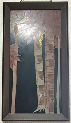 ![]() こちらの作品は漆の木を描いたもの。木の幹に入っている横線は、漆を採取した時の切り傷です。 木から漆の液を採取するのには非常に時間と手間がかかるため、とても貴重な品だったそうです。 |