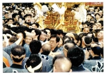 ![]() (写真中央。神輿の先頭の棒を担ぐ竹之内会長。) |