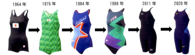 <参考資料㈫及び㈬>水着の形の変遷 ※1969年から2006年の間はスピード社からライセンスを受けてミズノが製造・国内販売を行っていました。 |