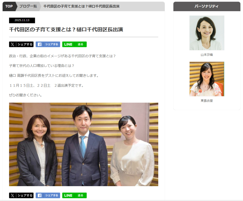 ひろば(みんなの掲示板) 投稿する ニッポン放送“フェムケア”に樋口区長登場! 神田ッ子 2025/11/16(日) 0:00 お聴き逃しなく! 11月15日(土)15時50分~16時ニッポン放送“フェムケア”に樋口区長登場!11月15日、22日の2週にわたり「千代田区の子育て支援」について話されます!聞き逃した方は下記のタイムフリーからどうぞ!https://radiko.jp/#!/ts/LFR/20251115155000 明大通り沿道 帰宅困難者避難訓練 大好き神田事務局K 2025/11/14(金) 16:20 11月14日(金) 14:46より帰宅困難者避難訓練を行いました。「区民」「学生・従業員」「外国人・要配慮者」「帰宅困難者」に分かれ、キタコンDXや千代田区防災アプリのレクチャーなどを受けました。 各ブース 大好き神田事務局K 2025/11/14(金) 16:25 キタコンDXの使い方などを学び、実際に明治大学リバティタワーまで歩き、チェックイン・チェックアウトまで一連の流れを体験しました。 防火のつどい コダマ・ヒナ 2025/11/13(木) 13:28 全電通労働会館防災部長感謝状 人命安全対策等推進功労に小川町北部一丁目町会署長感謝状 火災予防業務協力功労に内神田鎌倉町会の 村瀬 暁美 婦人部長 無火災町会に小川町北三町会 村瀬さんの後ろ姿 小川町北三町会の小林会長 祝辞 コダマ・ヒナ 2025/11/13(木) 14:11 受賞者の皆様おめでとうございます 神田消防懇話会 大家会長 第二部は林家希林さんの防火防災講演 おめでとうございます 秋の火災予防運動 コダマ・ヒナ 2025/11/11(火) 10:53 坂井さん 村瀬さん 広報活動に出発 社会を明るくする運動 大好き神田事務局K 2025/11/10(月) 10:51 お茶の水小学校から千代田区役所まで、パレードを行いました。 千代田区消防団合同点検 コダマ・ヒナ 2025/11/8(土) 13:25 外濠公園午後2時から まもなく始まります 点検開始 コダマ・ヒナ 2025/11/8(土) 14:07 神田消防団、丸の内消防団、麹町消防団 丸の内消防団 救助訓練 コダマ・ヒナ 2025/11/8(土) 14:33 ブロック塀倒壊 麹町消防団 火災発生 コダマ・ヒナ 2025/11/8(土) 14:39 神田消防団です お疲れ様でした コダマ・ヒナ 2025/11/8(土) 15:11 神田消防団 小林団長のご挨拶で終了です 千代田環境フェア コダマ・ヒナ 2025/11/8(土) 10:48 区役所で開催中 色々あります ちよエコヒーロー宣言 コダマ・ヒナ 2025/11/8(土) 11:11 https://www.city.chiyoda.lg.jp/koho/machizukuri/kankyo/ondanka/kankyohairyokodosengen/seido.html 竹とプラスチックのカトラリーかタオルがもらえますよ LEDランタンづくり アロマスプレー作り ハーブ石けん作り 今日は一斉清掃 コダマ・ヒナ 2025/11/6(木) 6:37 朝早くから、御苦労様です 小川町北三 多町二丁目 司町一丁目 司町二丁目 その2 コダマ・ヒナ 2025/11/6(木) 10:53 お掃除日和 内神田鎌倉 園児さんも大勢参加 内神田旭町 西口合同パトロール 秋の火災予防運動が始まります 大好き神田事務局K 2025/11/5(水) 14:57 火災予防運動は、都民の皆様に防火防災意識や防災行動力を高めていただくことにより、火災の発生を防ぎ、万一発生した場合にも被害を最小限にとどめ、火災から尊い命と貴重な財産を守ることを目的としています。 また最近、都内では連日火災が発生しており尊い命や大切な財産が失われています。皆さん一人ひとりの心がけが火災を防ぐ大きな力になります。この機会に今一度防火対策の再確認をお願いします。詳しくは、下記の各ホームページからご確認ください。〇実施期間 令和7年11月9日(日)から令和7年11月15日(土)まで〇標語 ・令和7年度東京消防庁火災予防標語 「目で確認 声出し確認 火の用心」 作者 岩崎 公瑠美さん(清瀬市在学) ・神田消防署防災標語 「地域とともに 安全で災害に強い街 神田をめざして」〇ホームページ ・東京消防庁 https://www.tfd.metro.tokyo.lg.jp ・神田消防署 https://www.tfd.metro.tokyo.lg.jp/hp-kanda/index.html 沼津御用邸 司一あべ 2025/11/5(水) 5:40 11月4日、千代田区婦人団体協議会施設見学会で沼津御用邸記念公園に行ってきました雲一つない青空で40人参加のバス旅行です富士山が良く見えました沼津御用邸に着いて御用邸を見学しました明治26年大正天皇のご静養先として造営されましたが戦争で全焼し戦後間もなく御用邸は廃止されました後、昭和45年より都市公園として一般公開されました現在は那須の御用邸、葉山の御用邸が使われています皆さん興味深く見学致しました 御用邸入り口 大正天皇がお使いになっていた自転車 さざれ石 天皇家の系図 沼津御用邸2 司一あべ 2025/11/5(水) 5:52 お天気も良く楽しい1日になりました ビリヤード場 菊花展 神田公園地区婦人部長 富士山 なんだかんだ12 大盛り上がりの巻!! 錦町三丁目町会 2025/11/4(火) 13:06 11月3日文化の日、錦町三丁目路上を使った多目的イベント、「なんだかんだ12」が開催されました!天気も上々! これでもかといったパフォーマンスがそこかしこで炸裂!会場は500名を超える参加者でごった返しました!とても全部を紹介しきれませんが、そのそのほんの一部をご覧くださいっ! 10時、さあ、なんだかんだ12開幕です! オープニングは正則学園ビッグバンド部のみなさんが飾ります! 続いてダンススル会に
