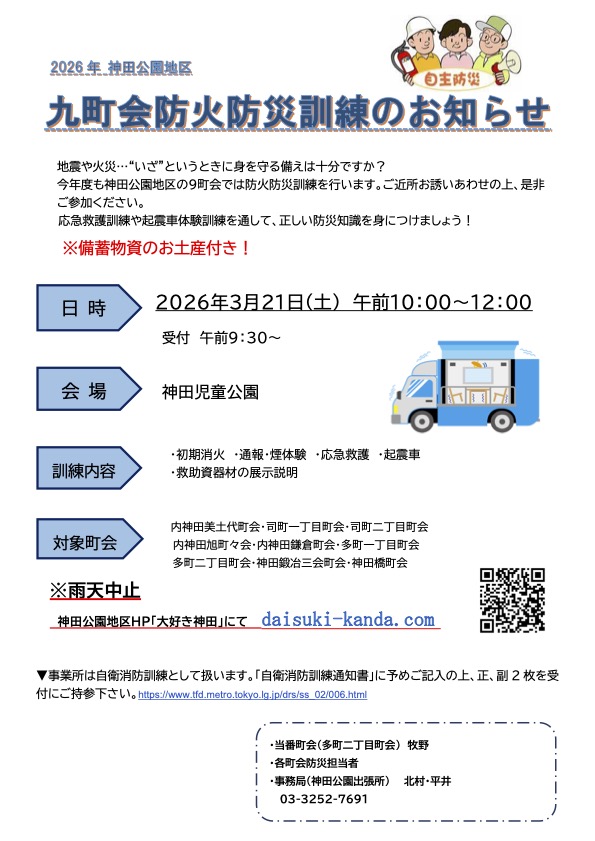 神田公園地区の九町会(内神田美土代、司町一丁目、司町二丁目、内神田旭町、内神田鎌倉、多町一丁目、多町二丁目、神田鍛冶三会、神田橋)が合同で防火防災訓練を実施します。 本訓練は、神田消防署および神田消防団第二分団のご協力のもと、AED操作・応急救護、初期消火、煙体験・起震車体験などを中心とする実践的な訓練です。 「地域の防災力強化」のため、皆さまのご参加をお願いいたします。 ※ヘルメットをお持ちの方はご持参ください。 1 日 時 令和8年3月21日(土)午前10時〜正午 受付開始:9:30〜 ※雨天の場合は中止いたします。 2 訓練場所 神田児童公園 3 訓練内容 ①初期消火訓練 ②煙体験 ③起震車体験 ④AED操作・応急救護訓練 ⑤神田警察ブース など ※参加者には、備蓄物資を配布いたします。 なお、「自衛消防訓練通知書」をご記入のうえ受付にご提出いただいた場合は、自衛消防訓練として取り扱います。 訓練に関するお問い合わせは、各参加町会の防災担当部長まで。 |