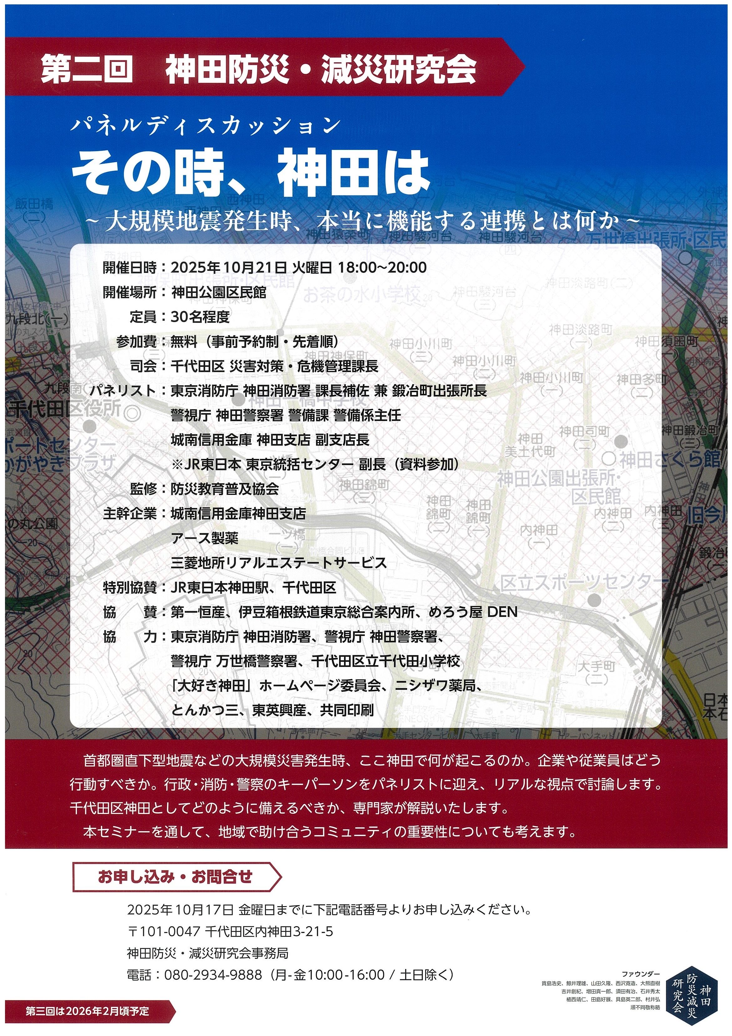 日時:2025年10月21日(火) 18:00~20:00 場所:神田公園区民館 4階 (千代田区神田司町2-2) 定員:30名程度 参加費:無料(事前予約制・先着順) お問合せ:神田防災・減災研究会事務局 080-2934-9888 |