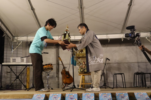 試合前に、前回優勝者の「かえってきためめたん」による優勝トロフィー返還が行われました。
